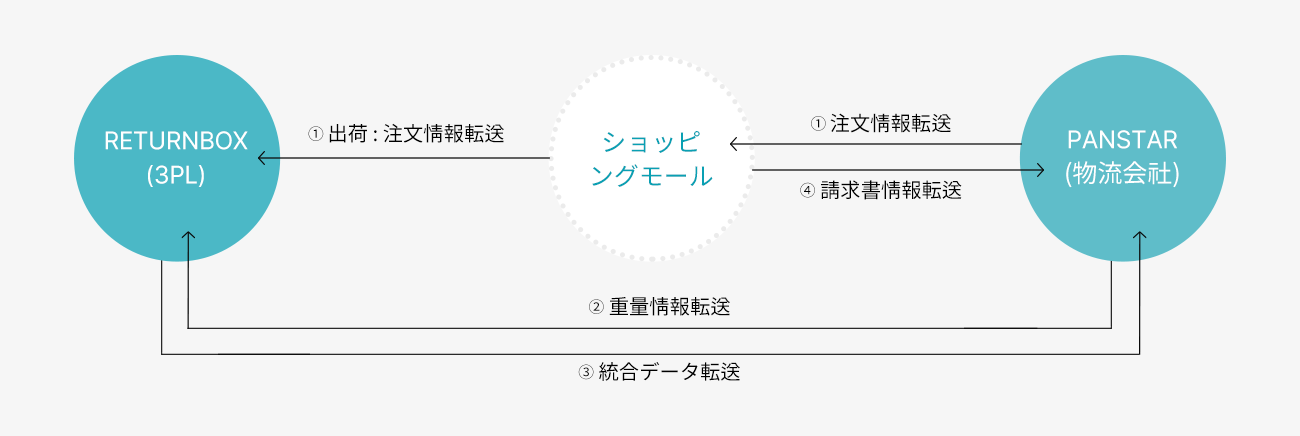 統合運送場出力のためには、ショッピングモール運営会社、輸出船会社Panstar、3PL社(株)リターンボックス間のデータ転送、物流会社と宅配会社間のデータ転送ともリアルタイムで行われなければなりません。